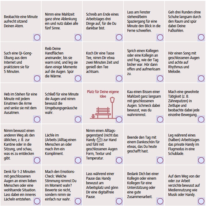Das Achtsamkeits-BINGO enthält 24 spielerische interaktive Übungen für mehr Achtsamkeit im (Arbeits-)Alltag. Es bietet täglich eine Übung für Einzelspieler oder aber für Teams, um das Miteinander zu stärken.